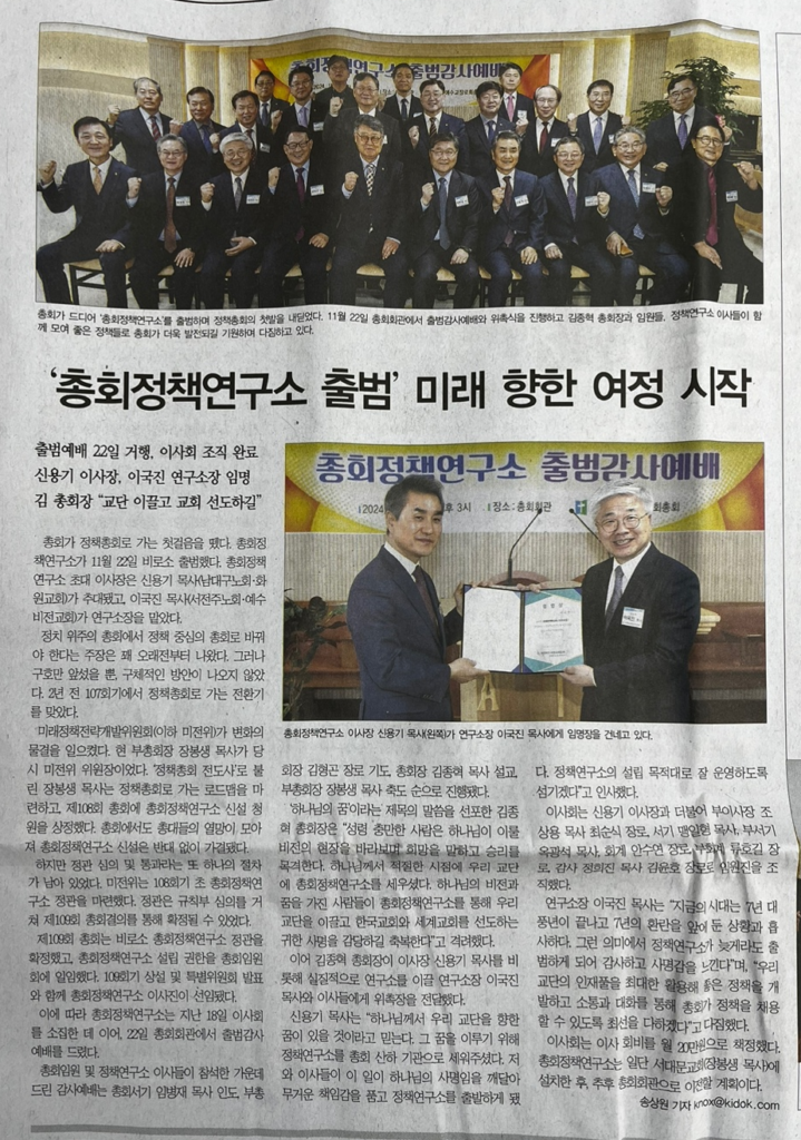 [기독신문] ‘총회정책연구소 출범’ 미래 향한 여정 시작됐다 admin 2024/12/13 언론보도 0 댓글 2024.11.22 https://www.kidok.com/news/articleView.html?idxno=307845 글 내비게이션 Previous Previous post: 악한 권세, 악한 명령에도 복종해야 하나요?Next Next post: [기독신문] 총신 선배들 “학교와 후배 적극 지원” 답글 남기기 응답 취소이메일 주소는 공개되지 않습니다. 필수 필드는 *로 표시됩니다댓글 * 이름 * 이메일 * 웹사이트 다음 번 댓글 작성을 위해 이 브라우저에 이름, 이메일, 그리고 웹사이트를 저장합니다. Current ye@r * Leave this field empty